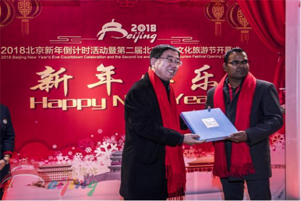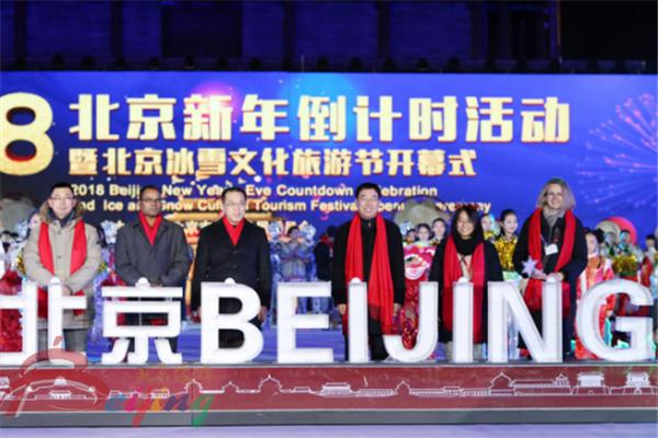 国家旅游局副局长杜江、北京市政府副市长王宁、马尔代夫大使费萨尔·默罕默德先生、缅甸参赞杜丹达凯女士和各界代表共同启动2018北京新年倒计时活动暨北京冰雪文化旅游节开幕式