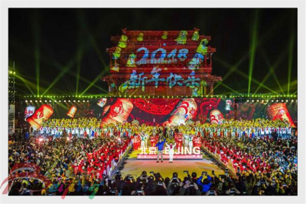 23点42分,伴随着《中轴赋》的诗画开篇,拉开了迎接2018新年的序幕。“时光的回音”、“新时代交响”、“未来的召唤”三个篇章融会贯通,既展示了北京厚重、丰富的历史文化内涵,又展现了朗朗新时代的首都风貌,更表达了开启新征程的决心和气魄。接下来,来自芬兰首都赫尔辛基、巴西城市贝洛奥里藏特、斯里兰卡城市科伦坡、西班牙城市塞维利亚、秘鲁首都利马等五个世界旅游城市联合会会员城市的市长,通过视频为北京送来新年的祝福,表达对北京国际交往中心建设和促进世界旅游城市共同发展的美好祝愿。23时59分,中外嘉宾与来自北京旅游行业一线的代表和中外游客代表共同启动倒计时60秒,大屏幕中再现了一幕幕中轴线的历史场景、一幅幅中轴线上美妙的景观和一组组距离2018年越来越近的数字,全场观众热情洋溢,不约而同地高声呼喊,“10、9、8、7、6、5、4、3、2、1”,2018的新年钟声在古老的中轴线上响起!